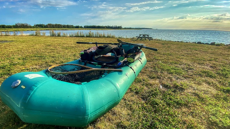 Nej båden er ikke punkteret, men blev pumpet op om dagen hvor luftemperaturen lå på godt 30 grader. Hen under aften og efter opholdet i det 8 grader varme vand i elven, fylder luften mindre. Med K-pumpen kan der hurtigt spædes op med lidt luft.